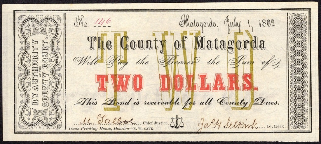Texas. County of Matagorda. $2. Matagorda, July 1, 1862. Medlar 8. No. 146. Red denomination. Chief Justice signature lower left, County Clerk lower right. Printed on the back of an inverted R.A. Shepherd and Co. of Galveston check. AU.