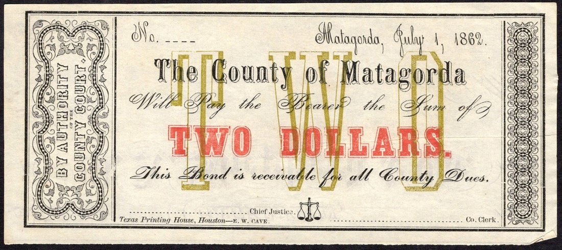 Texas. County of Matagorda. $2. Matagorda, July 1, 1862. Medlar 8. Red denomination. Printed on the back of an inverted R.A. Shepherd and Co. of Galveston check. Unissued. AU.