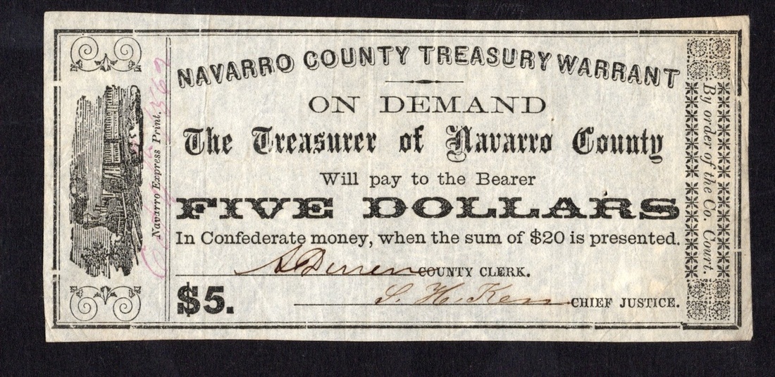Texas. Navarro County Treasury Warrant. $5. Oct. 1 1862. Steam locomotive and train left panel, "By Order of the Co. Court" in right. "Will pay to the bearer Five Dollars in Confederate money, when the sum of $20 is presented". Navarro Express Print. Very Fine.