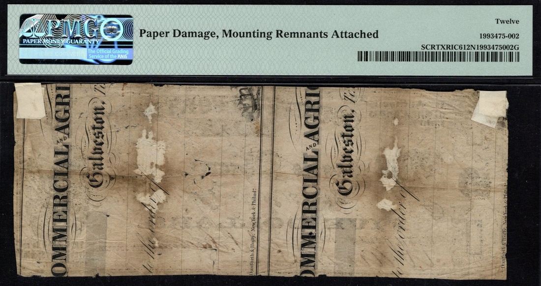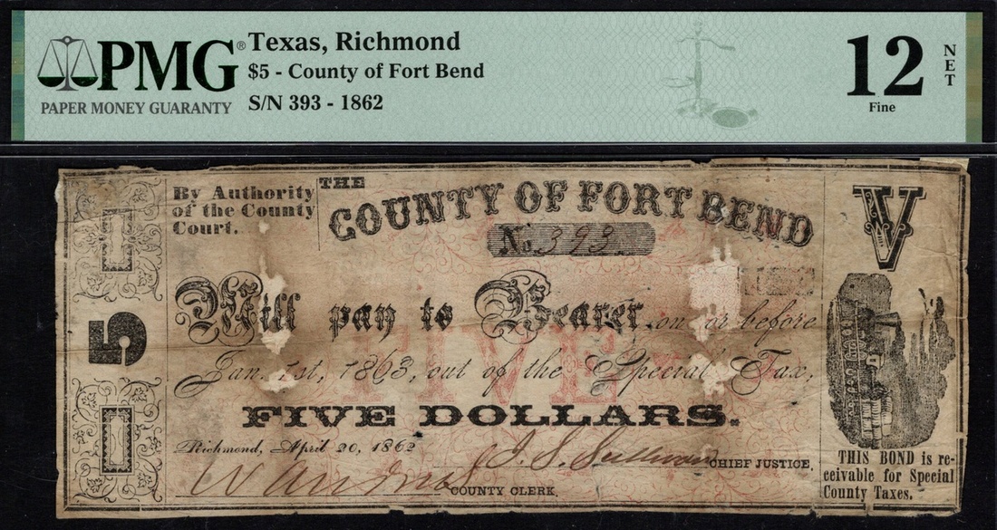 Texas, Richmond. County of Fort Bend. $5. April 20, 1862. Medlar-unlisted. Printed on the back of drafts of the Commercial and Agricultural Bank of Galveston notes. Very rare. PMG Net Fine 12, paper damage, mounting remnants attached. Ex Heritage Sale, Feb. 24, 2015, lot 84291.