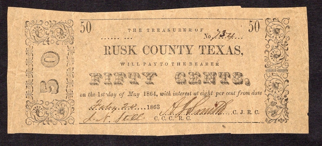 Texas. Treasurer of Rusk County. 50 Cents. Feb. 20 1863. Medlar 1 (R-7). Ornate right panel, "50" in left panel. No. 734. Very Fine.