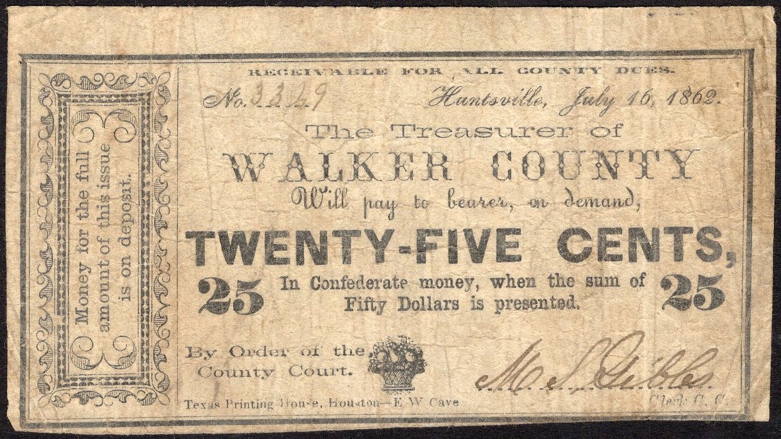 Texas. Walker County. 25 Cents. July 16 1862. Medlar 1 (R-7). Endorsed on back. Very Good.