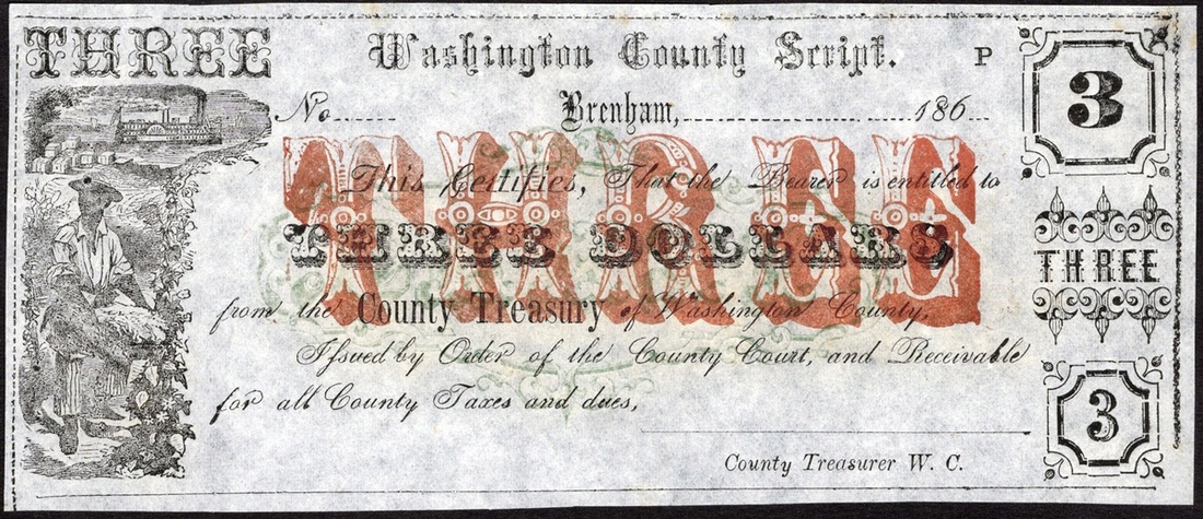 Texas. Washington County. $3. Brenham 186x. Medlar 5. Cotton picker at left. Large red denomination with light green cartouche overprint. Unissued remainder. Uncirculated.