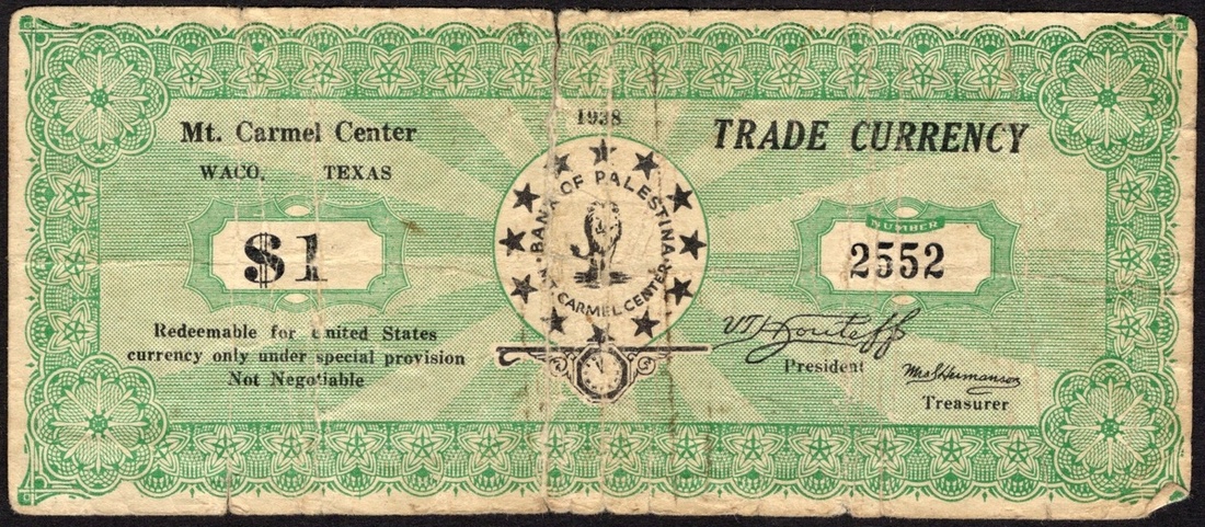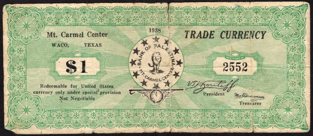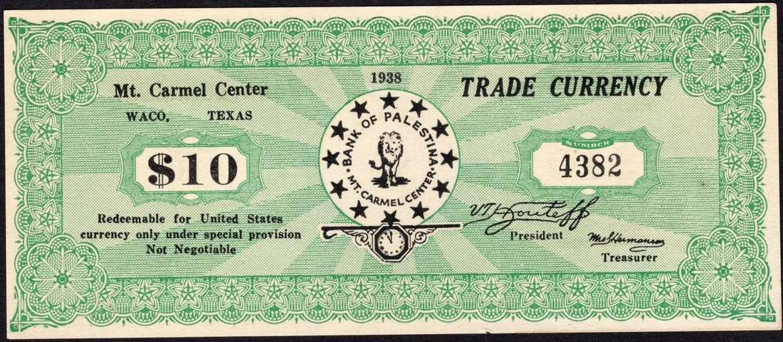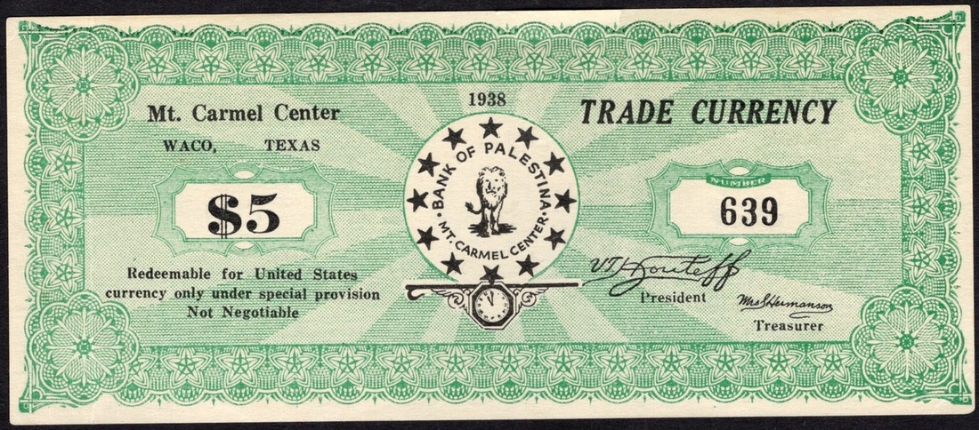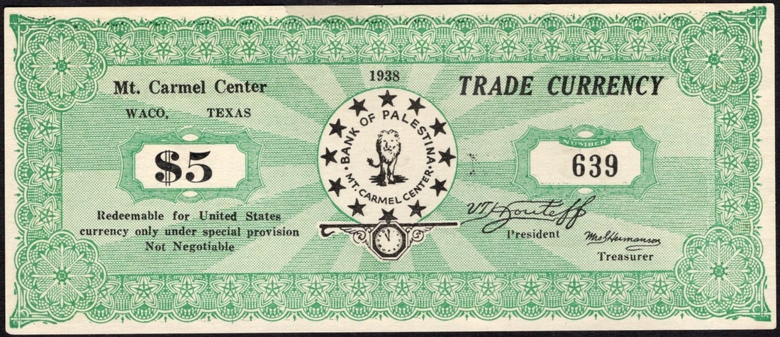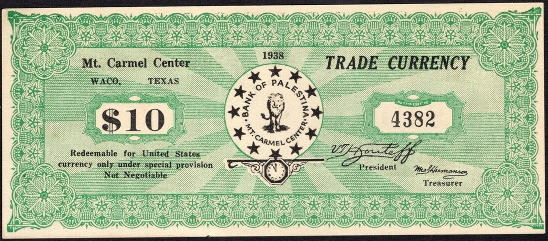 Texas. Mt. Carmel Center Trade Currency. 5, 10 (red), and 50 Cents. Waco 1938. Cardstock rounds; and 1 Dollar, 5 and 10 Dollars. Bank of Palastina, Mt Carmel Center, Waco 1938. Paper. Rounds -- Lion walking forward; Value stars around and clock vignette. Paper - Green and white. Lion walking forward, encircled by stars at center, printed signature of V.T. Houteff lower right. The Branch Davidians issued scrip in 1 Cent to $10 denominations in the 1930s. The clock vignette on these pieces is close to striking midnight as this group believed the apocalypse and Christ's return was imminent. Continuing the work of the break-away Seventh Day Adventist Victor Houteff, a Bulgarian emigrant to the US, these Branch Davidians were not associated with the later Branch Davidians of David Koresh that were raided by the ATF in 1993. The $10 Choice Uncirculated, the $5 AU, the $1 Fine with a 1 ¼ inch tear top edge center. The rounds Fine-EF. [8]