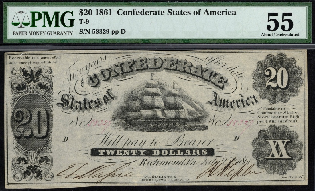 CSA. T-9. $20. July 25, 1861. Cr.31. PF-12. No. 58329, plate D. Sailing ship at center. "for" before "Treasr" printed. PMG About Uncirculated 55, previously mounted.