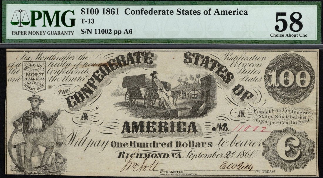 CSA. T-13. $100. September 2, 1861. PF-1. No. 11002, plate A6. Sailor at left, slaves loading cotton at center. PMG Choice About Unc 58, pinhole.