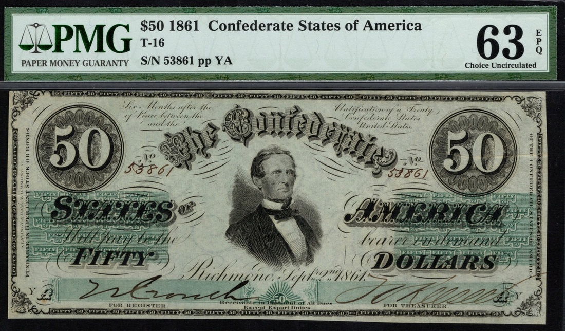 CSA. T-16. $50. Sept. 2, 1861. Cr.81. PF-3. No. 53861, plate YA. Jefferson Davis at center. CSA watermarked paper. PMG Choice Uncirculated 63 EPQ. Ex NASCA Auction 66, September 1987, lot 465.