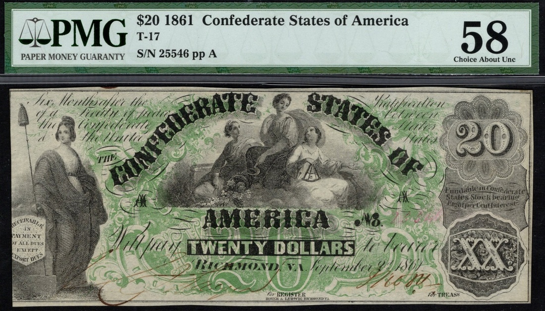 CSA. T-17. $20. September 2, 1861. PF-2 No. 25546, plate A. Liberty at left, Ceres seated between Commerce and Navigation at center. PMG Choice About Unc 58, annotation (back right margin). Ex NASCA Auction 66, September 1987, lot 473.