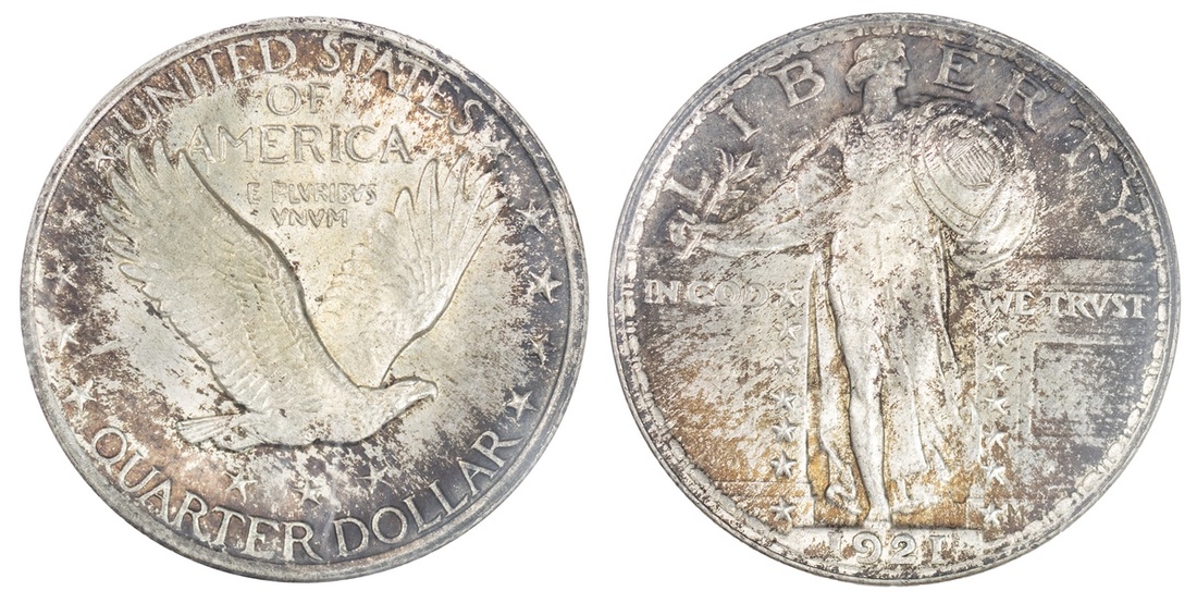 1921 Standing Liberty Quarter. NGC MS 65. Toned. A key date of the series; high-grade examples are particularly scarce and popular.