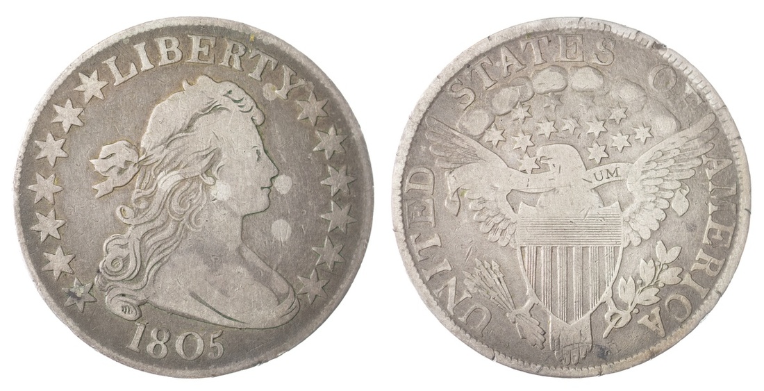 1805 Draped Bust Half Dollar. About Fine/VG. Some rim nicks, two pale obverse spots, hairline scratch reverse.