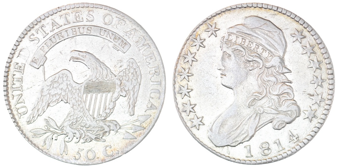 1814 Capped Bust Half Dollar. Very Fine details. Once cleaned, now toning.