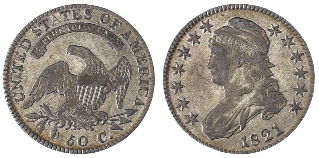 1821 Capped Bust Half Dollar. About Very Fine. Pearly gray.