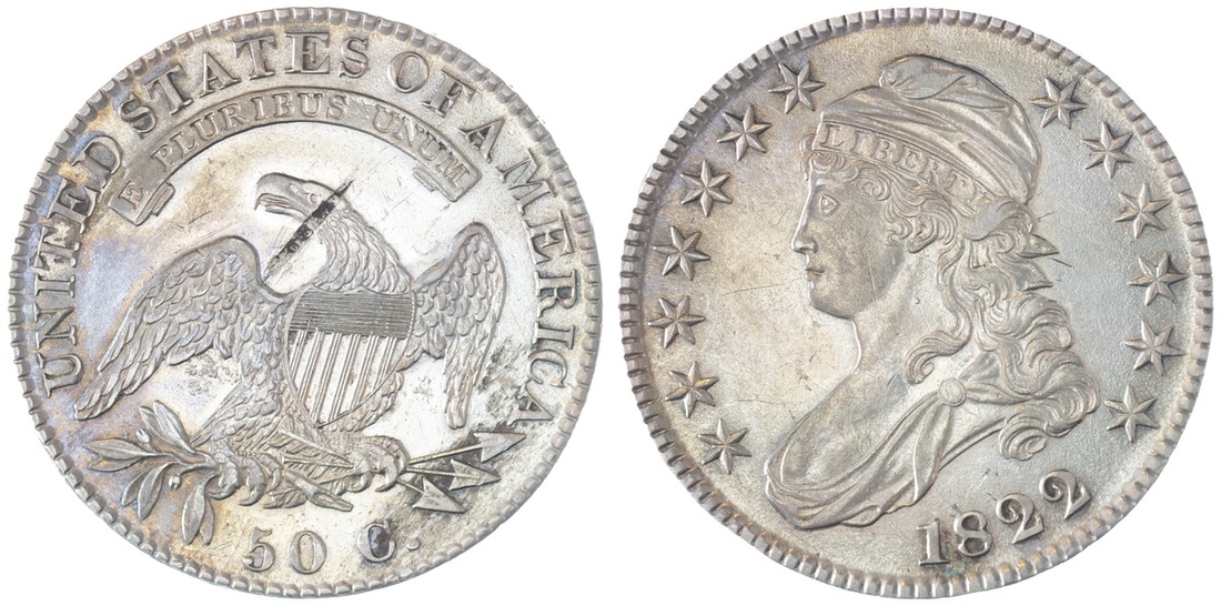 1822 Capped Bust Half Dollar. About Uncirculated. Once wiped, now toned. Dark streak on eagle's head.
