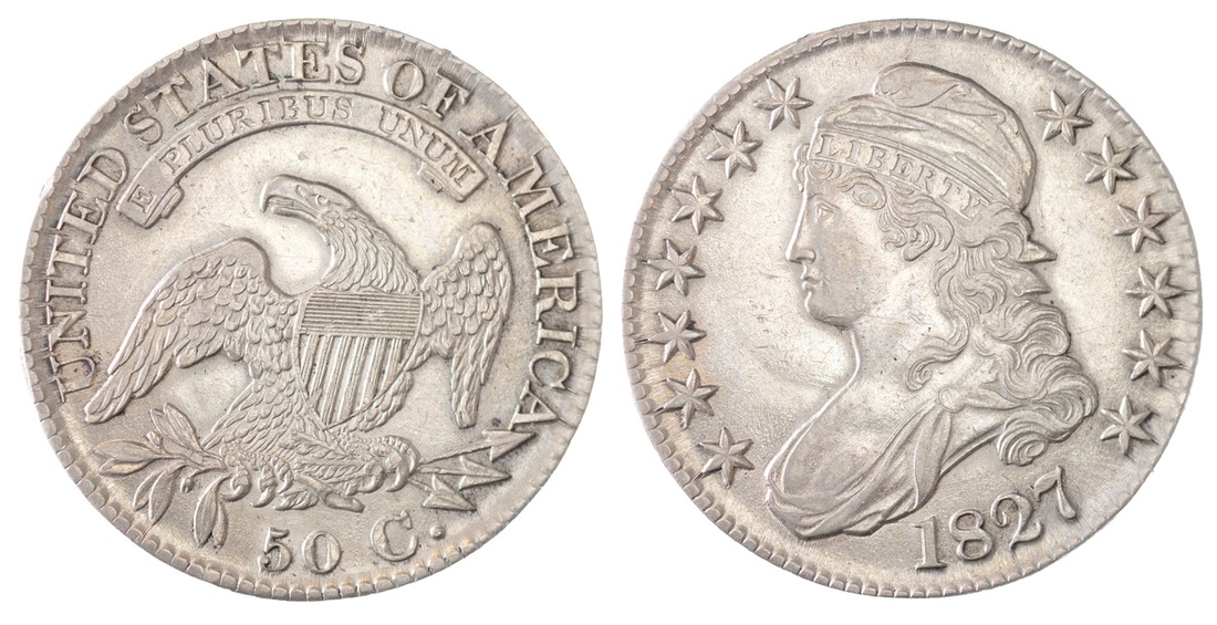 1827 Capped Bust Half Dollar. Curl base 2. Extremely Fine. Once lightly wiped. Lightly toned, good lustre.