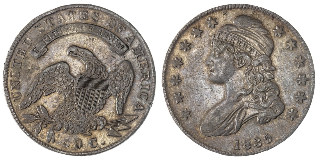 1835 Capped Bust Half Dollar. About Extremely Fine. Toned, champagne highlights, over some old hairline scratches.