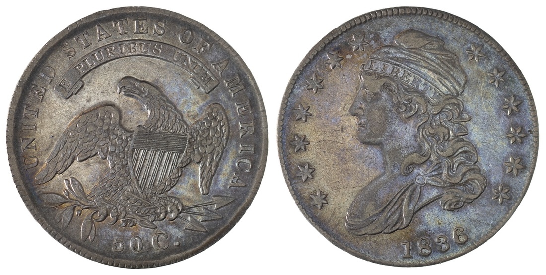 1836 Capped Bust Half Dollar. Lettered edge. About EF/EF. Pale purple-gray tone.