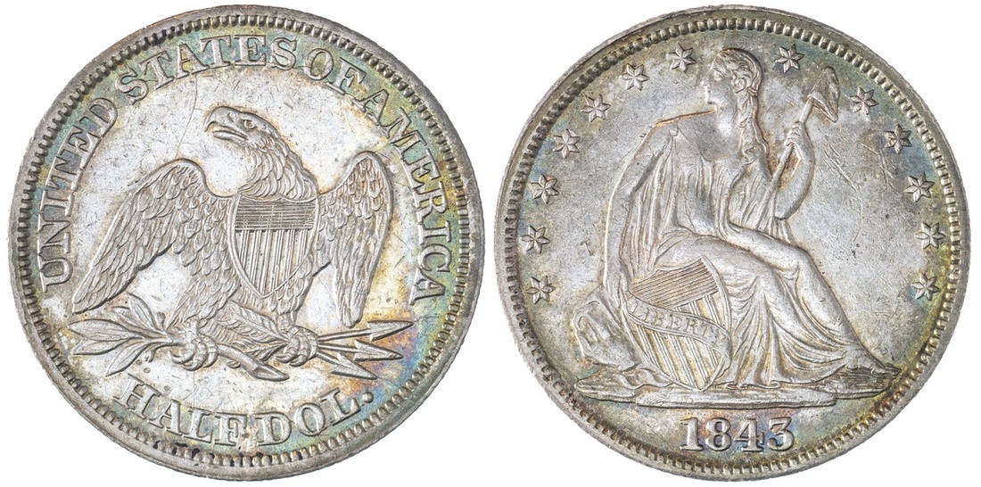 1843 Liberty Seated Half Dollar. EF/AU. Toned over some old stacking marks, turquoise and rosé hues.