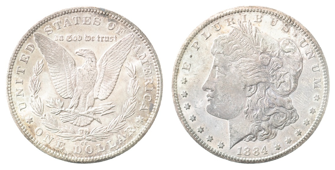 1884-CC Morgan Dollar. Brilliant Uncirculated. Some bagmarks. Pale violet and frosty white, bold lustre.