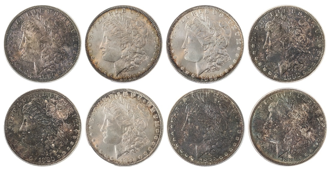 Octet of ANACS-graded Morgan Dollars: 1880-S, 1881-S, 1882-S, 1885 (2). MS 62; 1880-S, 1882-S and 1885. MS 61. Generally rich deep toning. (8)