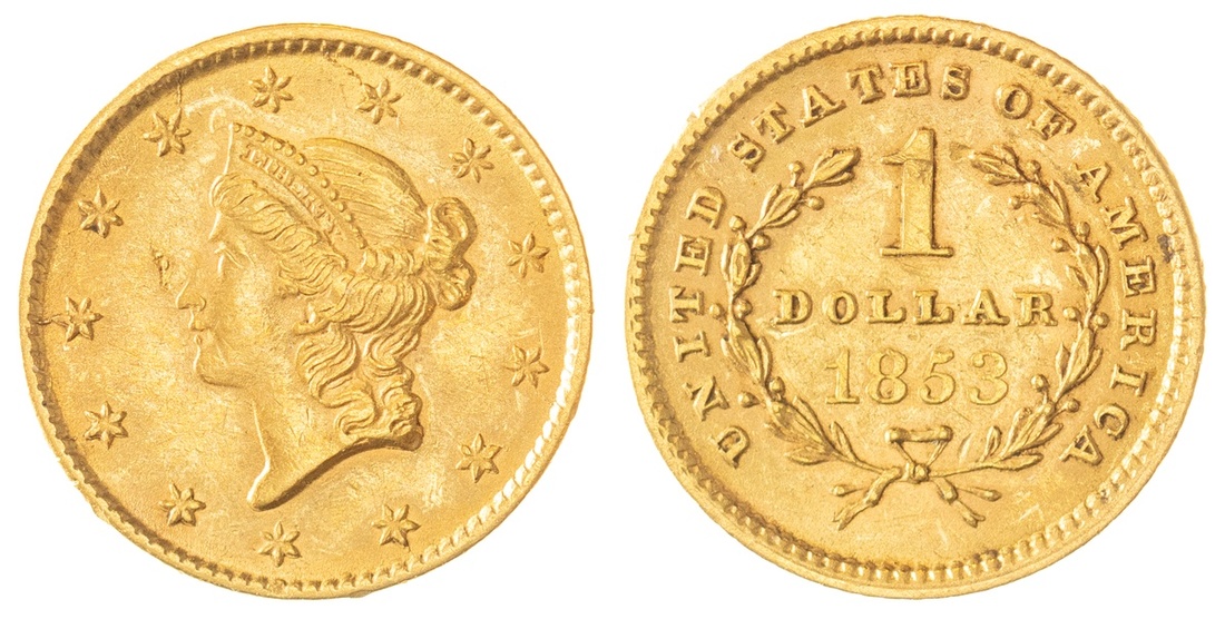 1853 Gold Dollar. Extremely Fine. Tiny obverse nick or planchet flaw.