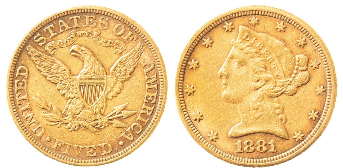 1881 Liberty Head $5. Extremely Fine. Toned over some stacking marks.