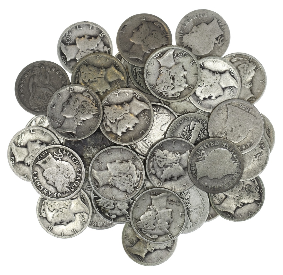 Lot of Circulated Silver. Dimes - 1835 (VG/About Fine), Liberty Seated (3), Barber (9), Mercury (29); Quarters - Liberty seated, Barber (4, one holed), Standing Liberty (10); Halves - Barber, Columbian (4); and a 1934-S Peace Dollar; also Buffalo Nickels (39) and Liberty head Nickels (10), worn 2 Cent pieces (6), 3 Cent Nickel (2), 3 Cent Silver, Indian Cents (2), a few damaged minors, and a 1918 Gratitude of Swiss Families to America Medal.