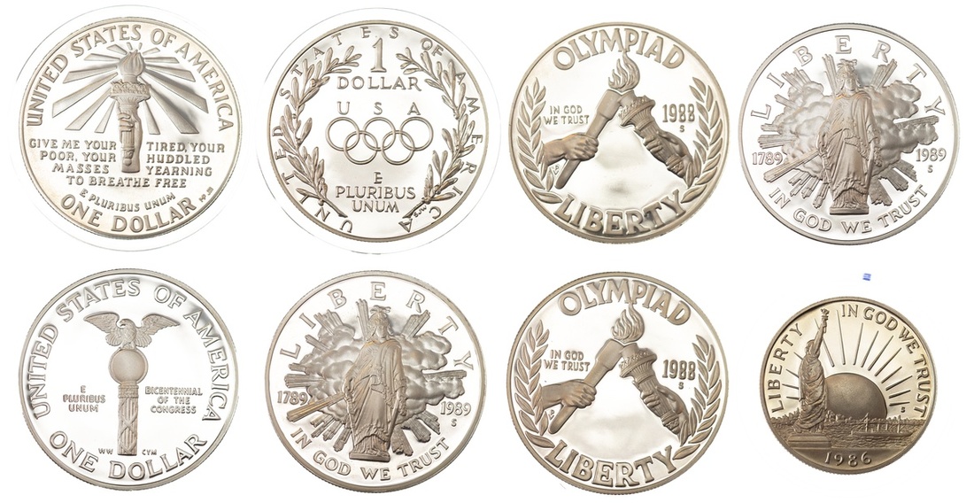 Lot of modern Commemorative Proof Dollars. 1988 Olympics (3), 1989 Congressional-Triumph of Democracy (8); and two-piece 1986 Liberty Proof Set. All in case of issue with CoAs. Choice Brilliant Proof.