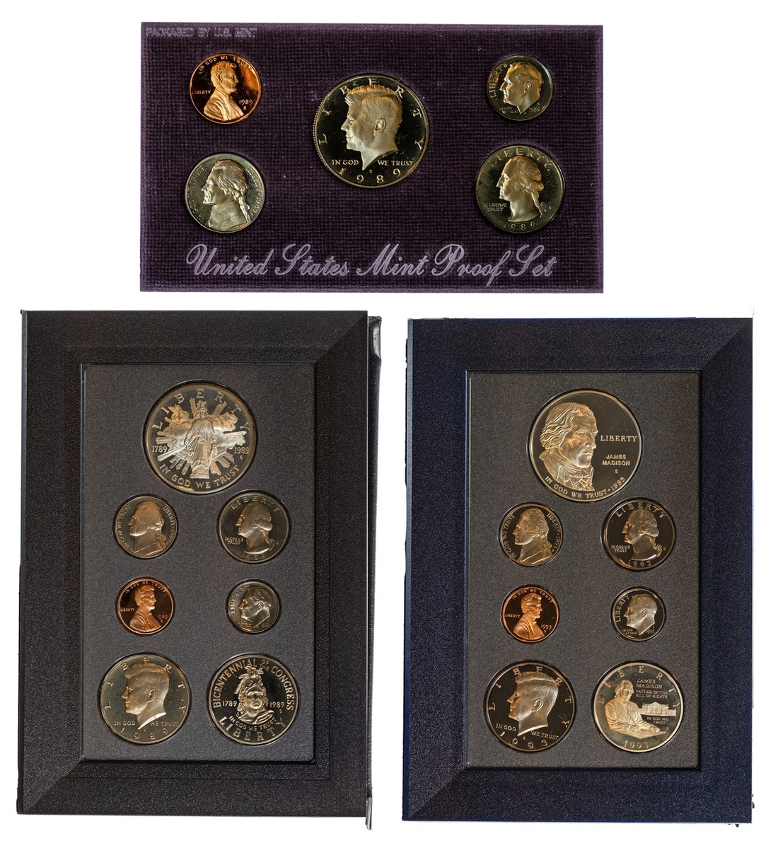 Lot of Modern Sets and Commemoratives. Includes: 1957, 1987, 1989 Proof Sets; 1989-S and 1993-S Prestige Proof Sets; Proof and Uncirculated 1971-S Dollar; 1971 (4), 1989-PD (2). All in original cases, sleeves; and Proof 1984-S and 1988-S Olympic Dollars.