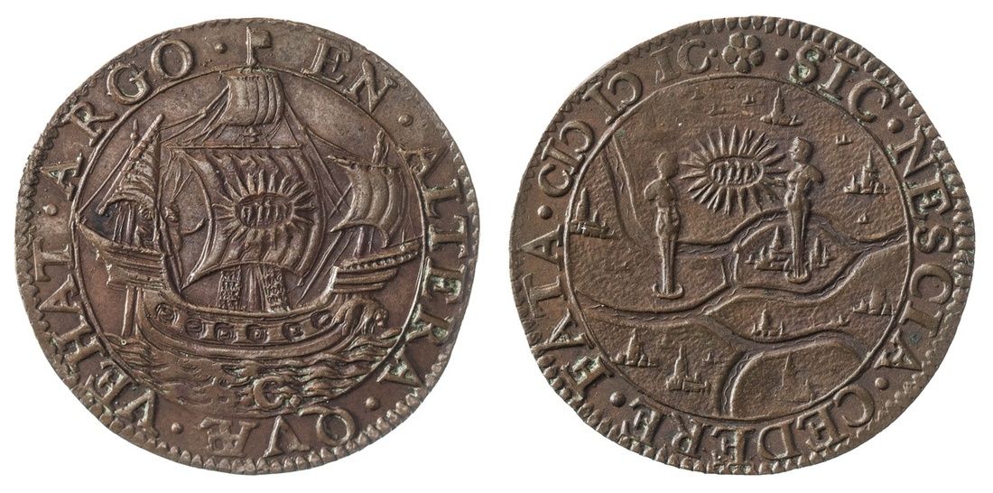 (1599) Capture of Saint Thomas by the Dutch/Victories of the Argo. AE Jeton, 29.1 mm. Betts-20, Van Loon I, 519. Dutch ship, "Jehovah" in Hebrew on sail; Latin legend: "See what [heroes] the second Argo carries", rev. Landscape with twin Termini - gods of boundaries, representing the islands of Bommel and Thiel, radiant "Jehovah" in Hebrew between them; "Thus the Fates who know not how to yield". The Dutch Admiral Van der Does here on this jeton is compared to the ancient hero Jason. Choice Extremely Fine.