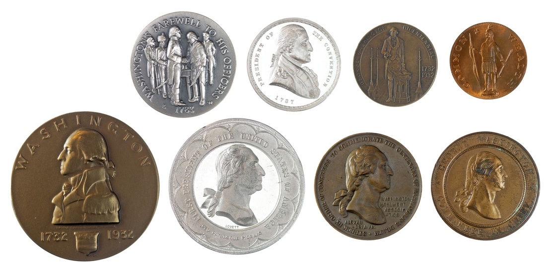 Washingtonia Lot. President of the Convention-Constitution Centennial, 1887. White Metal, 35mm. By Margan. Washington bust right/Independence Hall, Hamilton-Madison cameo above; New York Inaugural Centennial, 1889. White Metal, 50.6mm. By Lovett. Washington bust right/Brooklyn Bridge; Bicentennial Medal, 1932. Bronze, 56mm. By Laura Fraser. All Uncirculated; Valley Forge Centennial. Brone, 41mm. By Barber; Centenary of his Death, 1899. Bust right/Friendship Fire Co. Wagon. Bronze, 40mm; 1932 Bicentennial Medal by Whitehead-Hoag, Brone, 32mm; Farewell to his Officers. Modern Longines Medal. silver (.999), 40mm. EF-Uncirculated; also an Evans Copy (ca. 1948) Restrike 1788 Massachusetts Cent, Red and Brown BU.