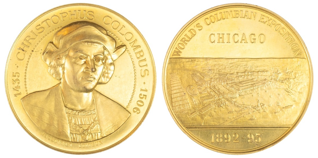 World Columbian Expo 1892-1893. Massonnet Medal. Gilt Bronze, 50.9mm. Eglit 99, Rulau X16. Columbus bust ¾ right, rev. Aerial view of the expo grounds. .