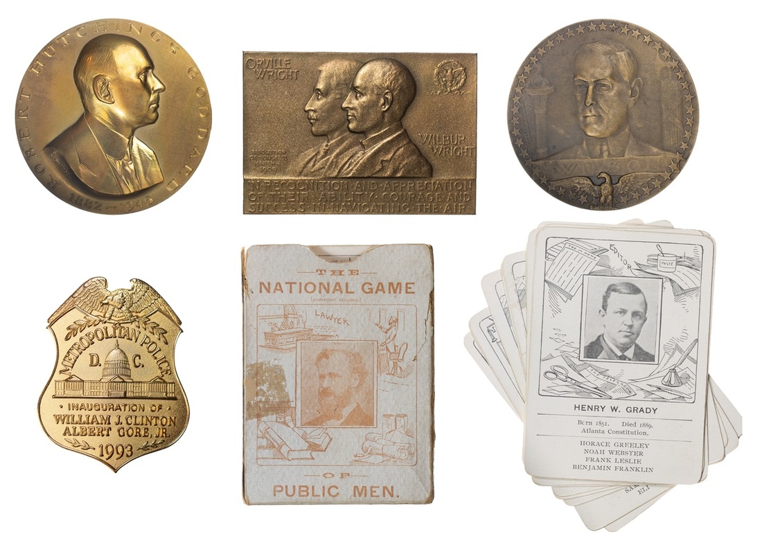 Group of large Medals and Sundry. Woodrow Wilson-U.S. Joins the Allies, 1917. Bronze, 68mm. By Rene Grégoire. 82 x 57mm. Wright Brothers, 1909 Medal of Congress. Bronze Plaque. 82 x 57mm; In Honor of Robert Hutchinson Goddard. By von Hebel. Bronze, 70mm; Metropolitan Police D.C. Inauguration of Clinton and Gore 1993 Gilt Bronze Badge. By Bastian, Geneva, NY. EF-Uncirculated; and "National Game of Public Men" late 19th Century card deck by Public Men Publishing Co., Atlantic City, NJ. Famous 18th-19th American figures on one side; U.S. Capitol on the other. Box cover with some splits and scuffs.