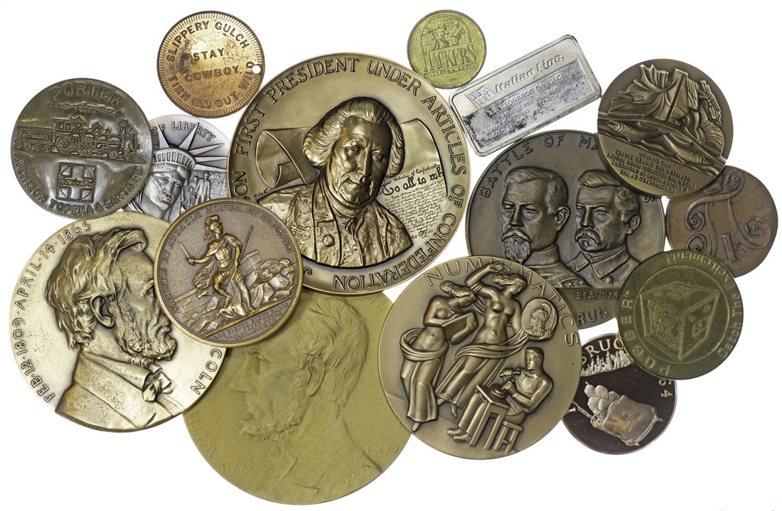 Large lot of mostly U.S. Medals and miscellanea. Large Bronzes --Lincoln - Malice Toward None MACo; Lincoln Birth Centennial GAR Medal; John Hanson/200th Anniversary Surrender of Cornwallis. U.S. Capitol Hist.Soc.; Bull Run/Civil War Centennial. Robbins Attleboro; White Pass and Yukon RR. MACo; Numismatics, Uniface; Statue of Liberty Centennial. Longines Symp. Sterling; Stockton & Darlington Railway 150th Anniversary. 38mm. Silver (hallmarked); Italian Line - Franklin Mint 1000 grains Sterling Silver bar; Miscellaneous smaller size Medals, 1926-modern (22); a Hard Times Token; a Russian 2 Kopeks 1798 EM. Fine-About VF; a few modern tokens and Russian bimetallic 10 Roubles (3), a RR Porter's badge.