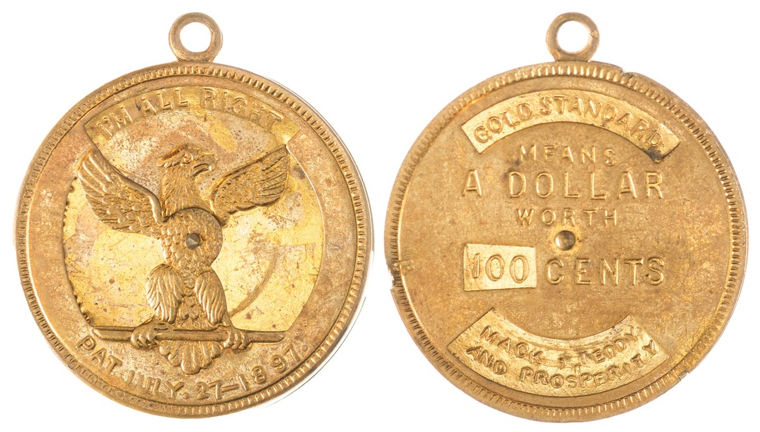 (1900) Bryan Money - Mack, Teddy And Prosperity. Shornstein 909. "Mechanical Dollar". Brass, adjustable. PAT JULY. 27-1897. Uncirculated. Ex Bowers & Merena Sale, March 27, 1987, lot 1180.
