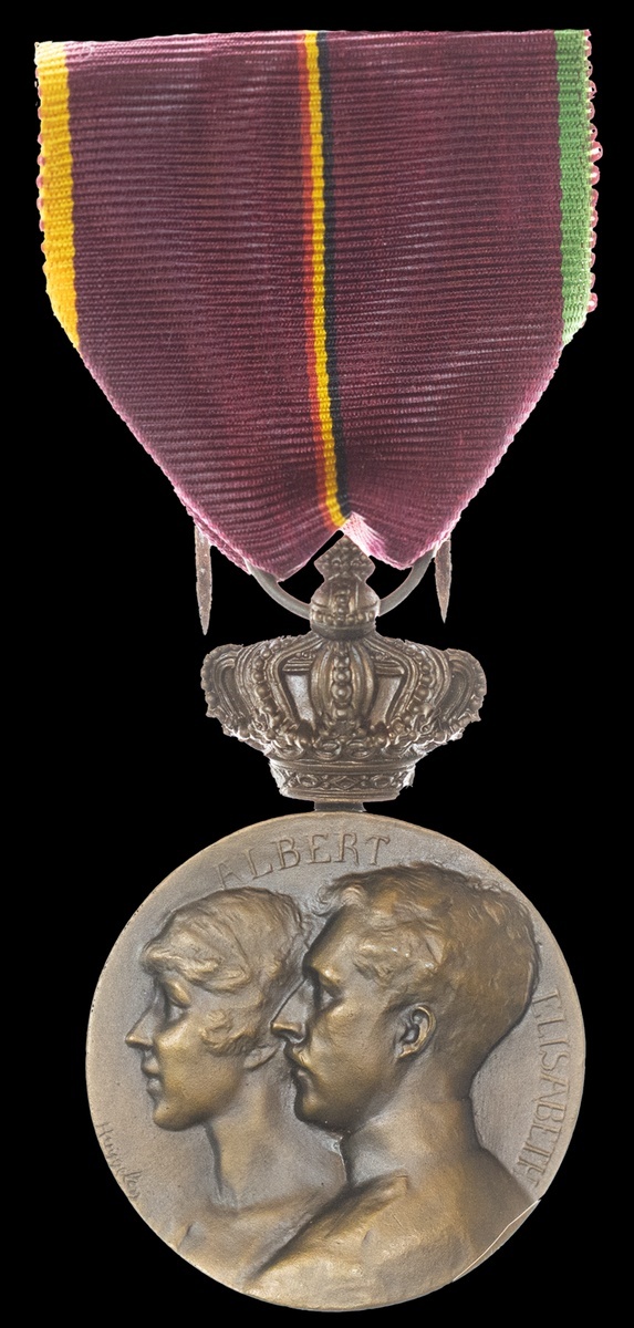 Brazil. Award Medal for Royal Voyage of King Albert and Queen Elisabeth of Belgium to Brazil, 1920. Bronze, 35mm (not including crown suspender). Busts of the royal couple left, rev. The battleship "Sao Paolo", date below. King Albert and Queen Elisabeth visited Brazil at the invitation of President Epitácio Pessoa. Sailing aboard the Brazilian battleship "Sao Paolo", the royal couple and Belgian entourage arrived in Rio de Janeiro September 19, and returned home October 18. The medal was instituted November 25, 1920, and awarded to officers. non-commissioned officers and crew of the "Sao Paolo", and also to Brazilian and Belgian civilians on board during the voyage.. Rare. On original ribbon and in Gustave Wolfers, Brussels case of issue. Choice Extremely Fine.