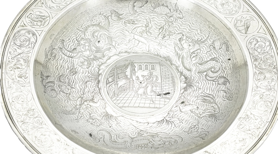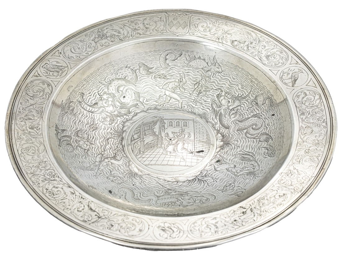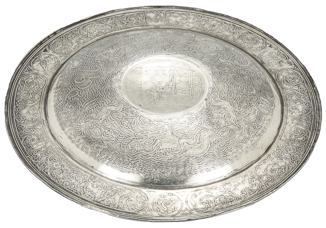 A Silvered Copper Personalized Serving Dish. Pressed metal with some possible hand engraving. With zoomorphic and nautical imagery, and a central roundel depicting two figures kneeling to pray in a bedchamber of Medieval style. Unmarked. Likely post 1850, Neo-Gothic and Asian [Japanese?] inspired. 279.37g, 25cm. [Spink XRF: 80% Copper; 19% Silver; 1% other metals]. Very fine condition.