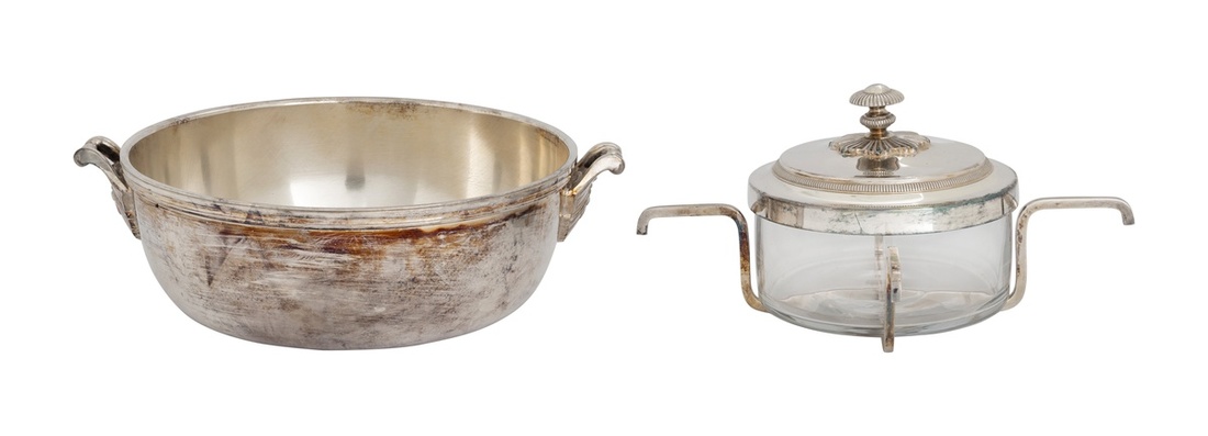 Includes glass caviar dish and lid, ice bowl and balance. Albi pattern, circa 1968. Stamped 'CHRISTOFLE FRANCE' and 'OC'. Total weight 846.71g.