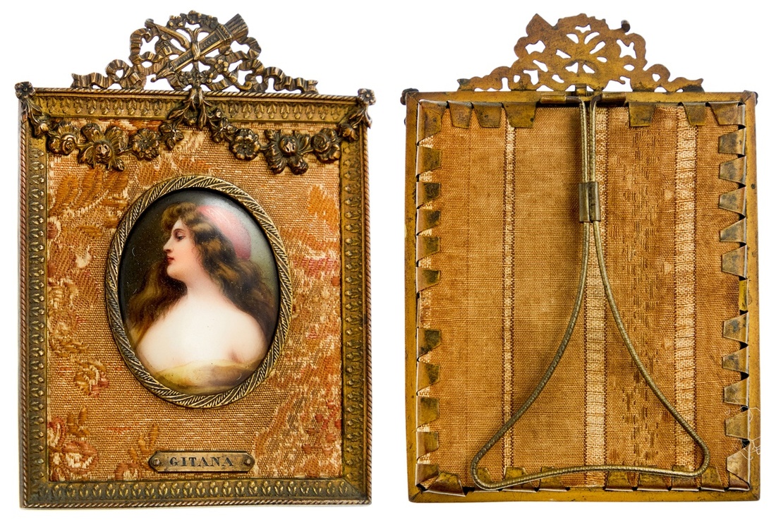 Portrait Miniature of a Gypsy Woman - "Gitana". Late 19th-early 20th Century. Oval, 1 3/4 x 2". Set in an ornate framed with fabric background, brass, floral garland and emblems of Arts atop, 3 3/8 x 4 3/4"., with stand. Attractive.