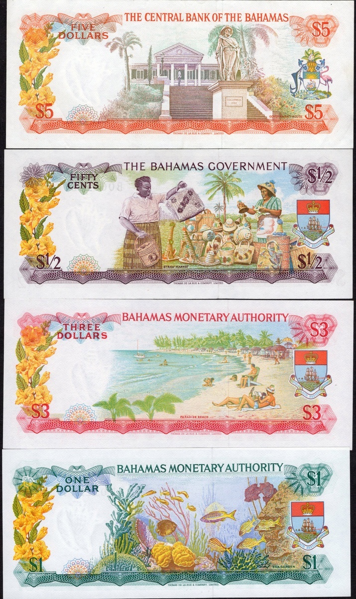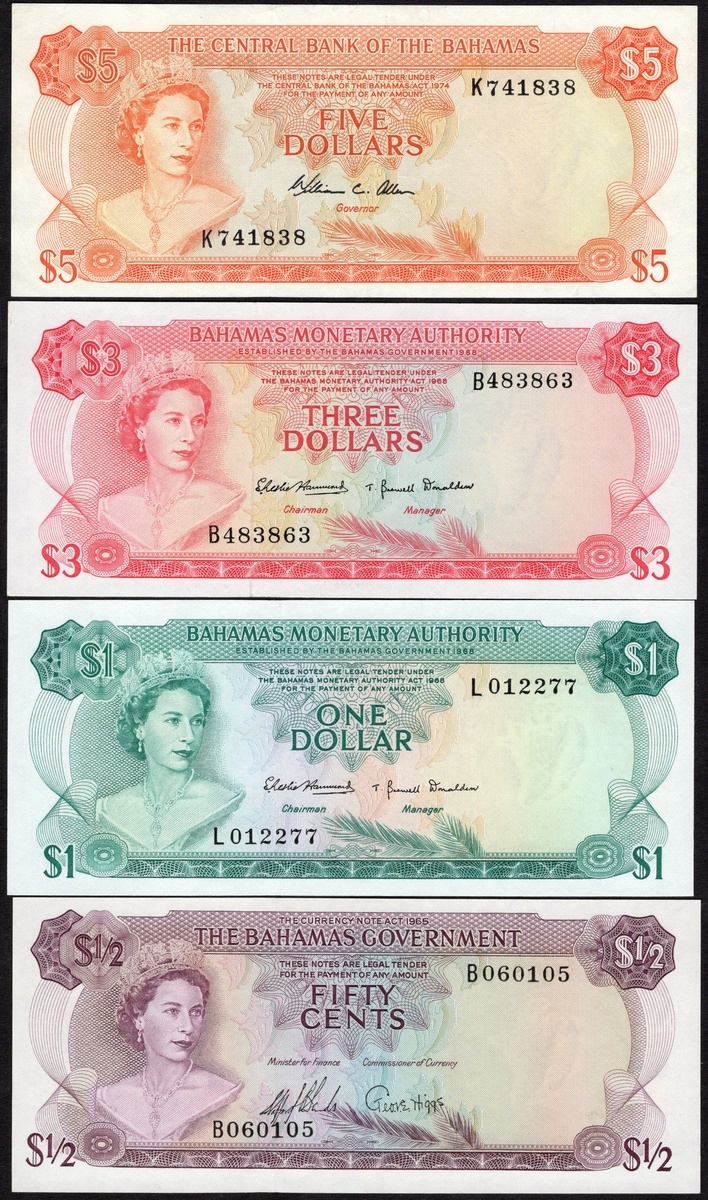 Bahamas. Lot. Bahamas Government. ½ Dollar. Law 1965. P-17a. Uncirculated; Bahamas Monetary Authority. 1 and 3 Dollars. Law 1968. P-27a, 28a. Uncirculated; and Central Bank. Law 1974. 5 Dollars P-37b. EF-AU. Elizabeth II at left. [4]