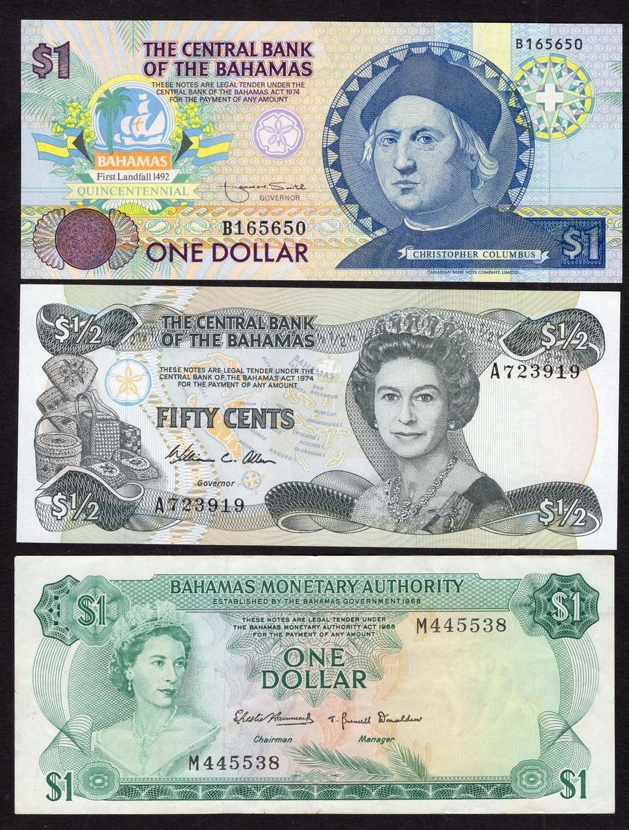 Bahamas. Lot. Monetary Authority. 1 Dollar. P-27 (5). About VF-EF; Central Bank. 1 Dollar. P-35a -- Fine-VF (3), EF-Choice AU (3); P-35b (2). About VF and VF; ½ Dollar. P-42 (2); 1 Dollar. P-43a (4), b; P-50 (4); P-57 (2); 3 Dollars. P-44a. Choice AU-Uncirculated; and 5 Dollars. P45a. Dirt spots on back, VF. [28]