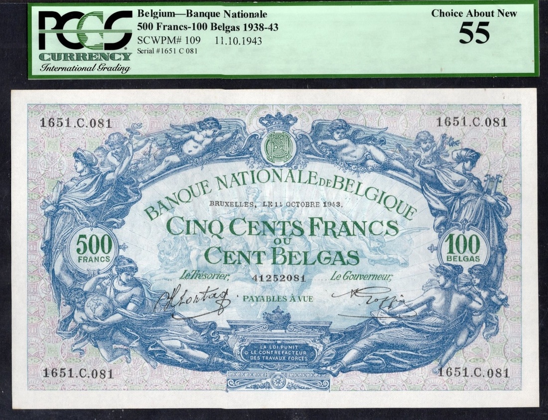 Belgium. Banque Nationale de Belgique. 500 Francs-100 Belgas. 11 Octobre 1943. P-109. No. 1651.C.081. Blue, blue-green, violet. Bank name and denomination in ornate frame of women and cherubs. PCGS Choice About New 55.