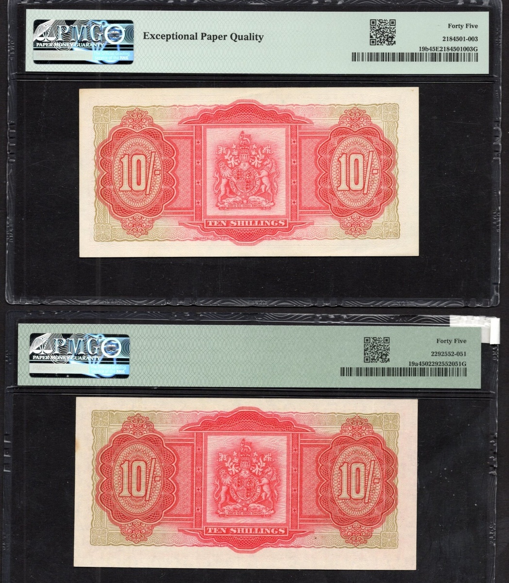 Bermuda. Bermuda Government. Pair of 10 Shillings. 1952, 1957. P-19a, 19b. red on multicolor. Queen Elizabeth II portrait at center, Fort in St. George below. PMG Choice Extremely Fine 45 and Choice Extremely Fine 45 EPQ. [2]