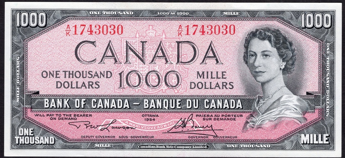 Canada. Bank of Canada-Banque du Canada. 1,000 Dollars. 1954 (1973-84). P-83d. No. A/K 1743030. Signed: Lawson-Bouey. Black on rose. Queen Elizabeth II at right; Central Canadian landscape on back. Some teller handling, AU.