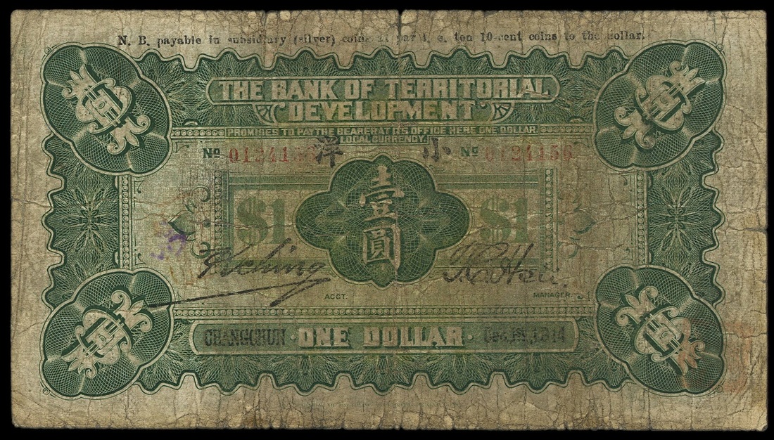 China. Republic. Bank of Territorial Development. 1 Dollar. Changchun 1914. P-566. With "Payable in subsidiary" overprint on top back. Green and black. Workers in field, line of pack-camels. Two small edge tears. About Fine.