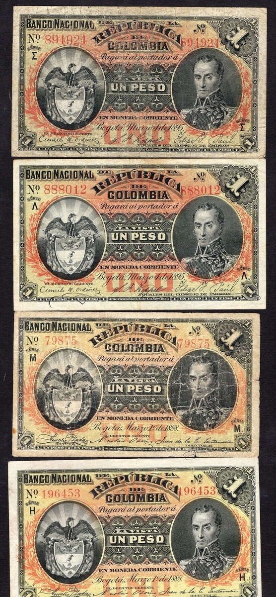 Colombia. Banco Nacional de la Republica de Colombia. Quartet of 1 Peso notes. 1888 (2). P-214. Series H and M. EF and About Fine; 1895. P-234. Series lambda and sigma . VF-EF and Fine. Bolivar portrait at right, Arms left. [4]
