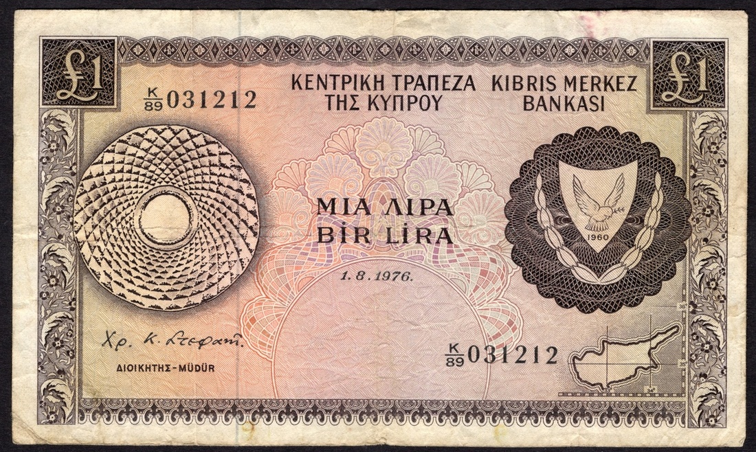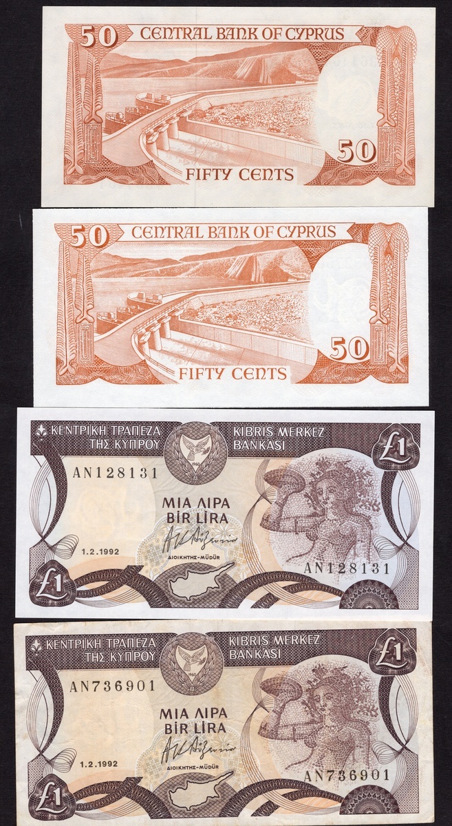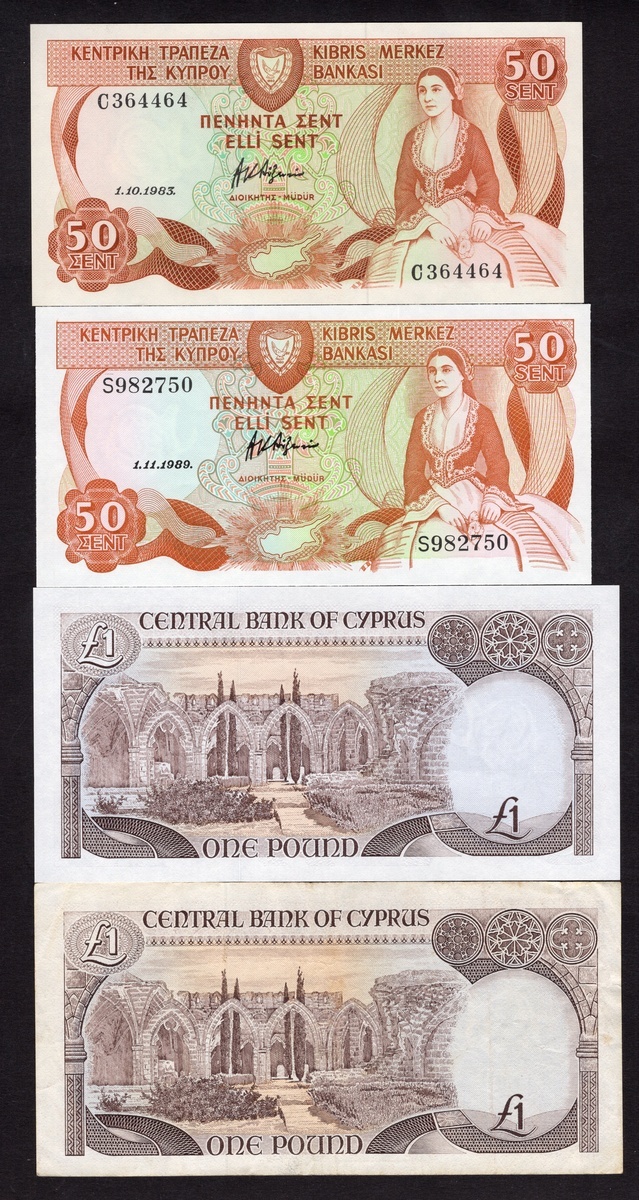Cyprus. Kibriz Merkez Bankasi. Lot. 50 Sent. 1-10-1983. P-49. AU; 1-11-1989. P-52. Unc; 1 Pound. 1-8-1976. P-43c. About Fine; 1-6-1979. P-46 (2). VF and EF; 1-11-1982. P-50. AU; 1-2-1992. P-53b (2). VF with light stain and Unc. [8]