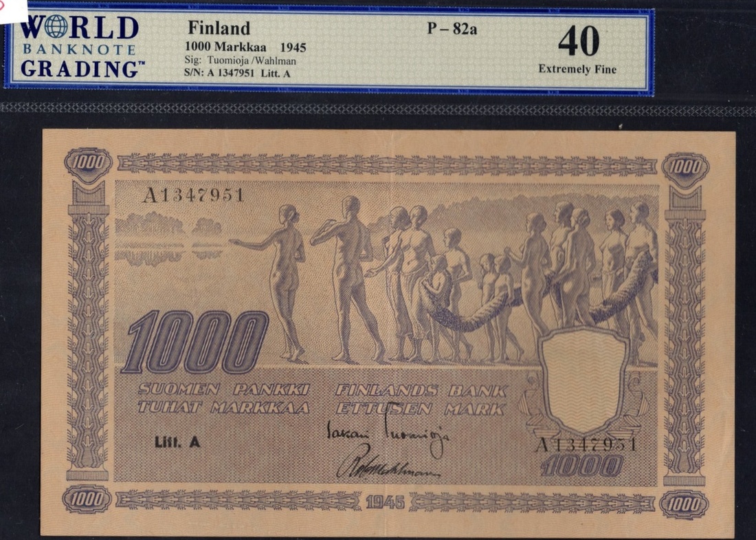 Finland. Finlands Bank. 1000 Markkaa. 1945. P-82a. No. A1347954. Blue-violet. Allegorical group of 13 people; Arms on back. WBG Extremely Fine 40.