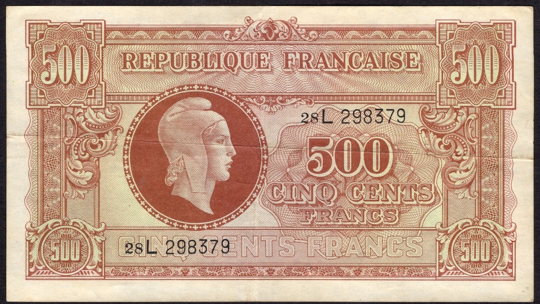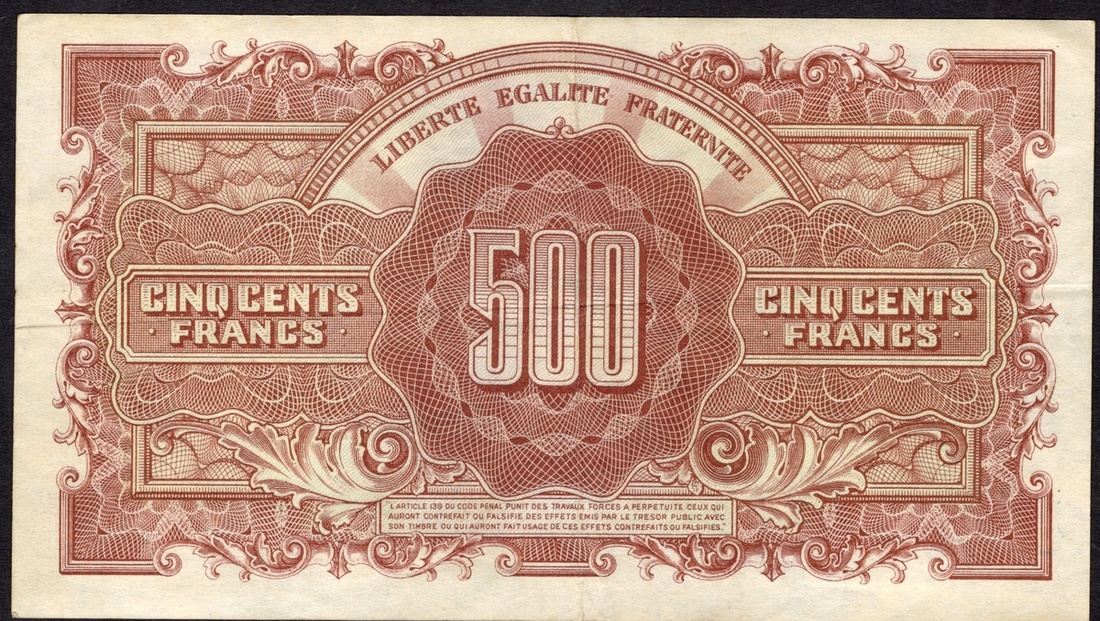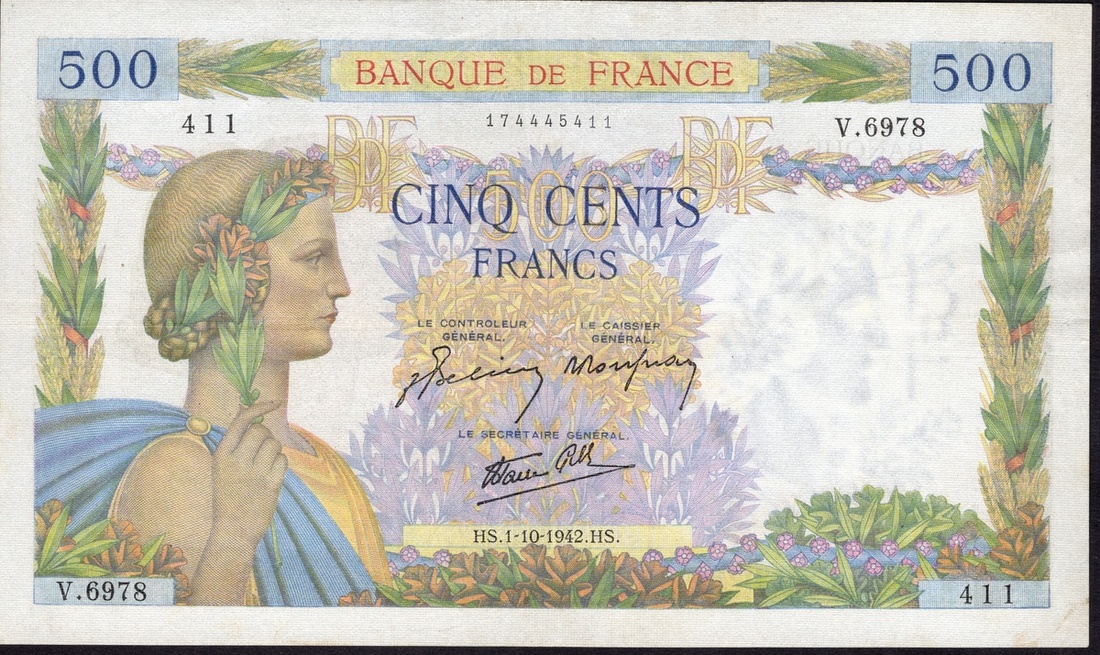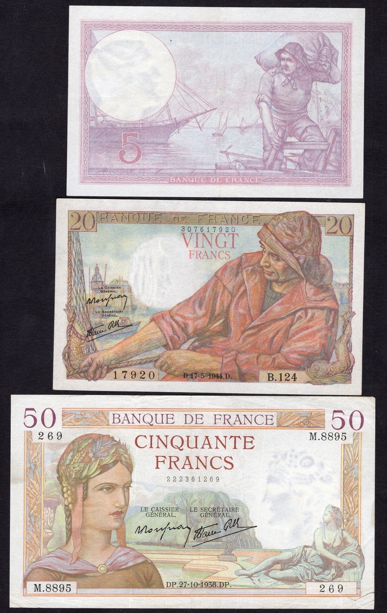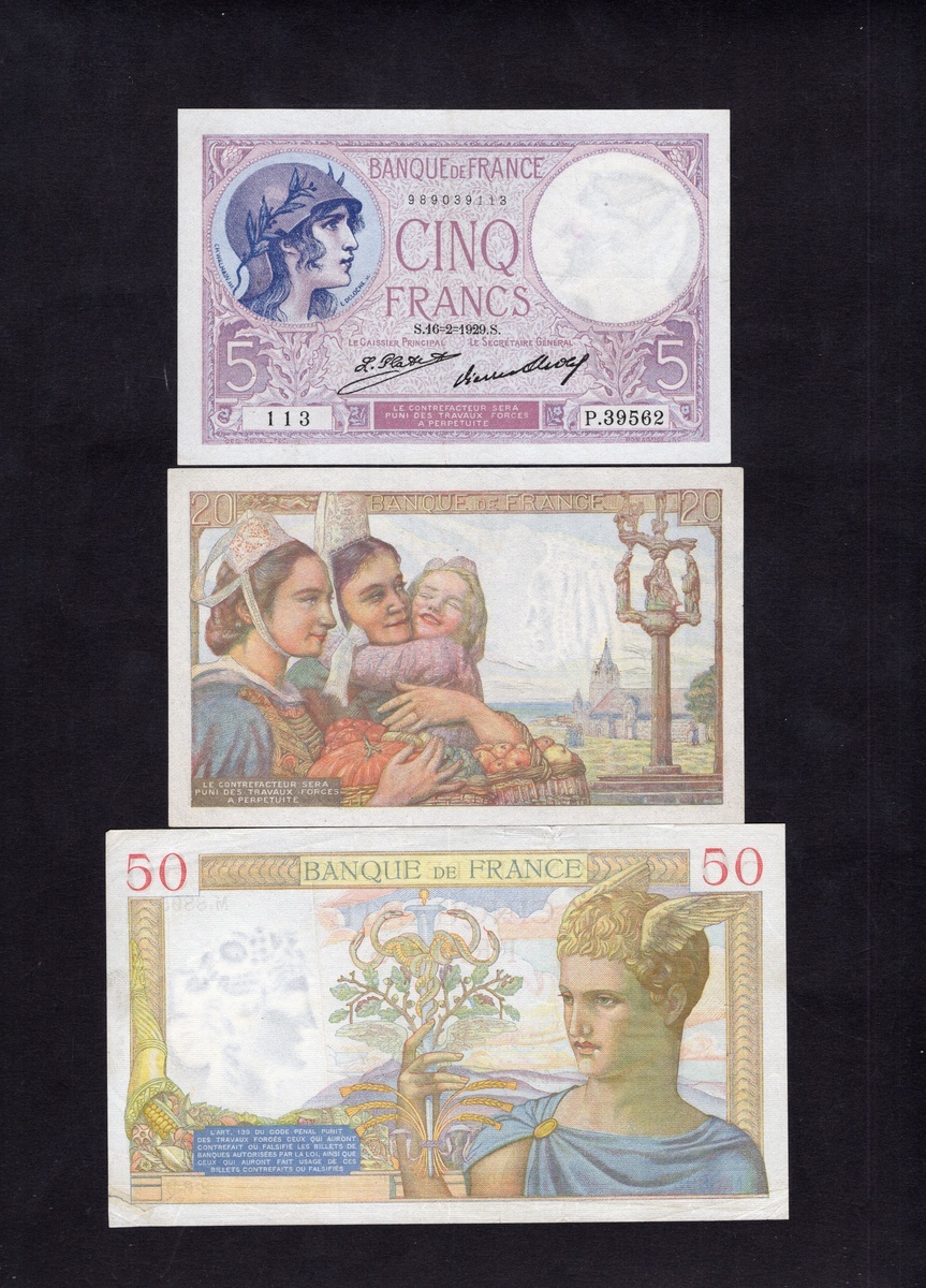 France. Banque de France. Lot. 5 Francs (2). 16-2-1929; 26-10-1930. P-72d. 50 Francs. 27-10-1938. P-85b; 500 Francs. 1-10-1942. P-95b. Allegorical women. Slight stain at corner. Extremely Fine; 20 Francs. 5-11-1942; 17-5-1944 (2). P-100a. One Uncirculated, the other two EF; and WWII-Tresor Centrale. 500 Francs. ND (1944). P-106. VF. [8]