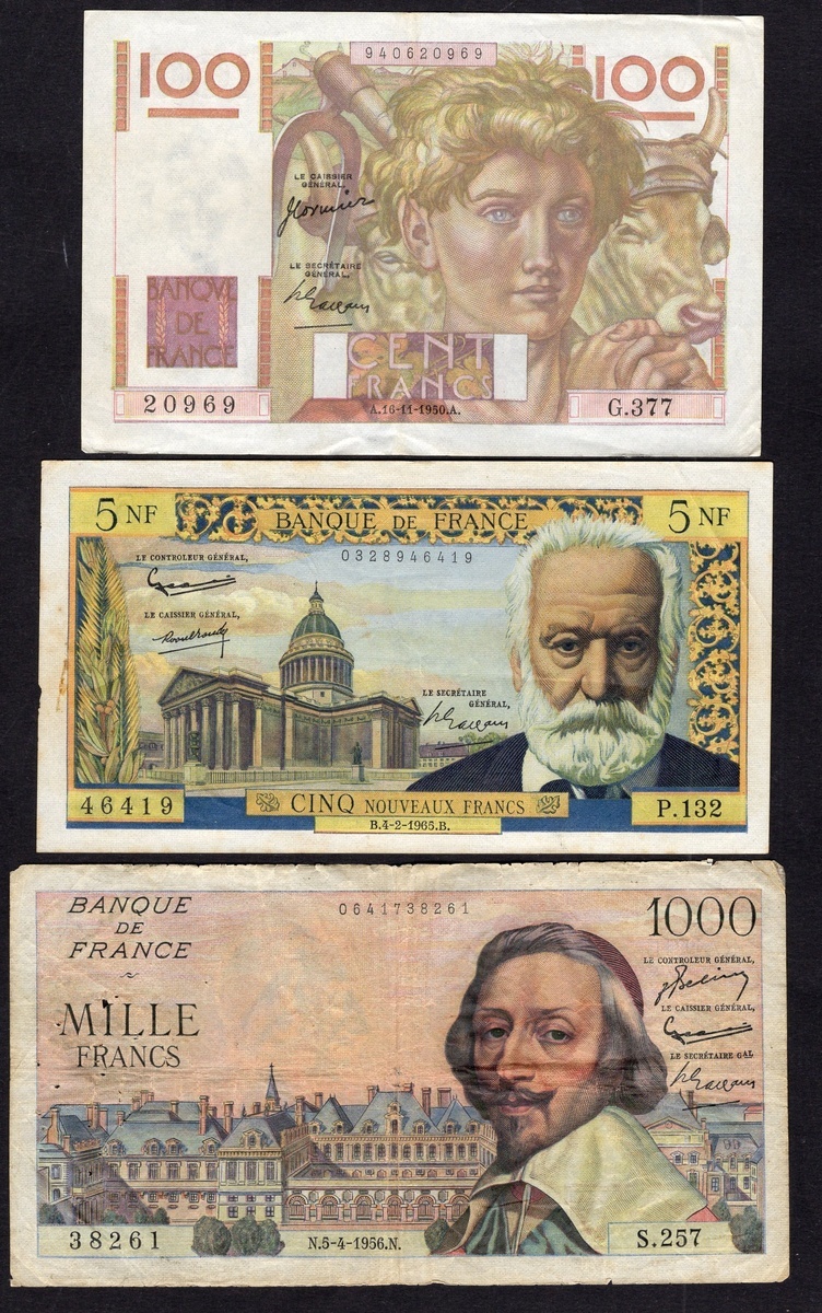 France. Fourth-Fifth Republic. Banque de France. Lot: 100 Francs. P-128b, c, d; 1000 Francs. P-134a (2). About Fine-VF; 5 Nouveaux Francs. P-141 (2); 10 Francs. P-147a (3), c (3), d; 100 Francs. P-149c, f. VF; 5 Francs. P-150a, c. AU-Unc; 50 Francs. P-152b (2), c (2), e, f. One of the 1987s Fine, the others VF-EF.