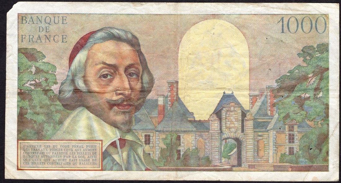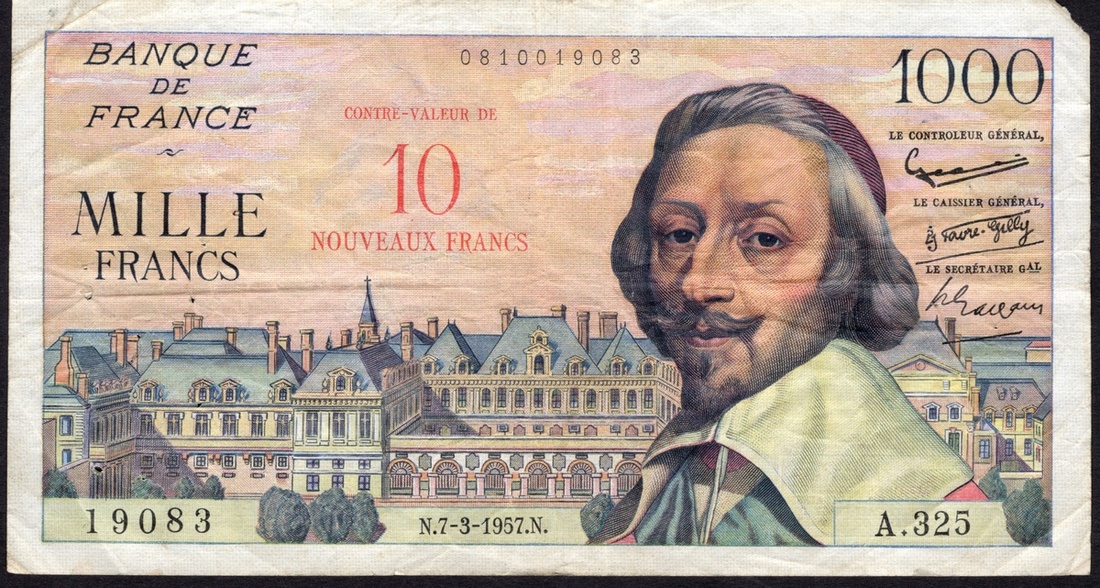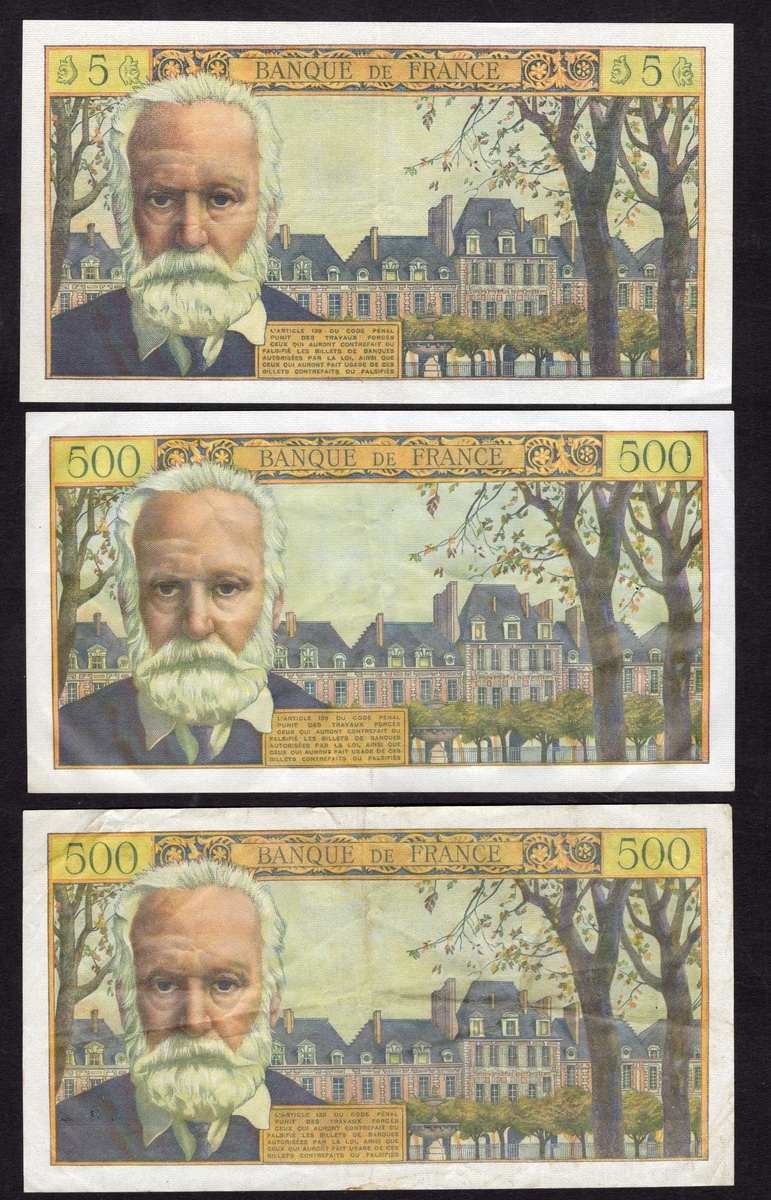 France. Banque de France. 1958-1965 lot. 500 Francs. 10-7-1958; 30-10-1958. P-133b. The first light stain in margins, About VF, the latter VF; 5 Nouveaux Francs. 1-6-1961; 2-11-1961; 1-7-1965. P-141. EF, VF, Uncirculated with slight teller handling. Victor Hugo at right; also 10 Nouveaux Francs on 1000 Francs. P-138. Cardinal Richelieu at right. Torn top corner, staple holes. About VF. [6]